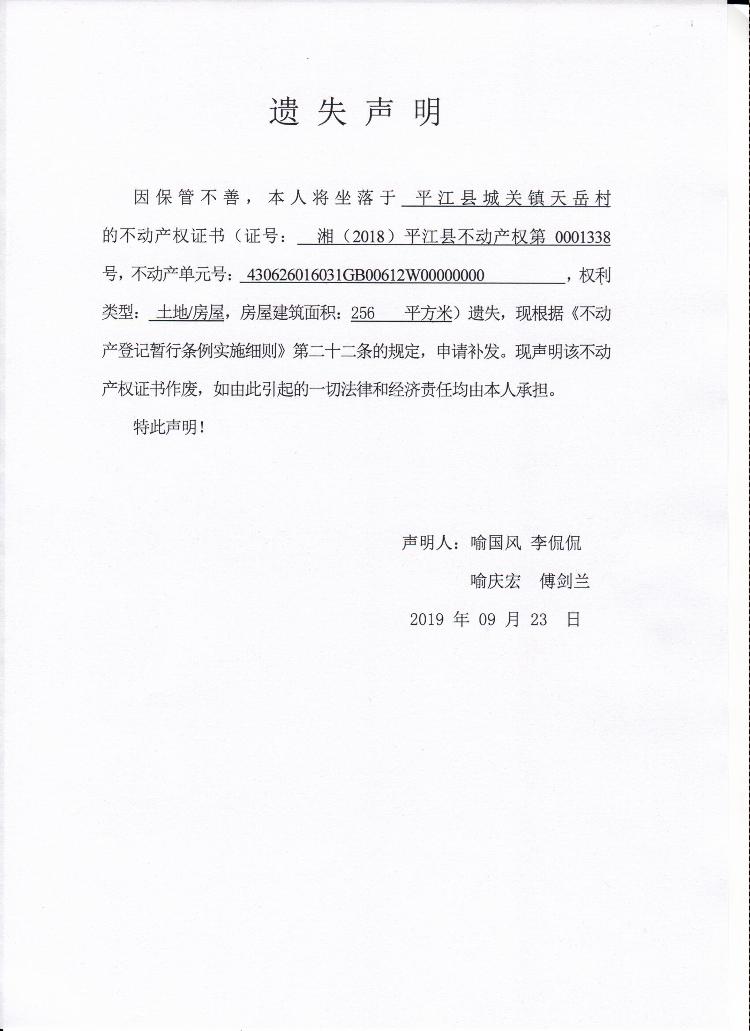 喻国风 李侃侃 喻庆宏 傅剑兰不动产证遗失声明
