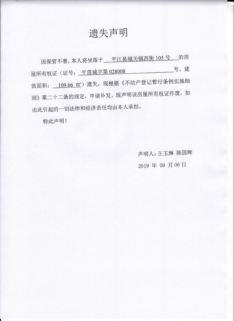 王玉琳 陈园辉房产证遗失声明