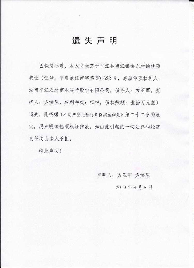 方亚军 方燎原他项权证遗失声明