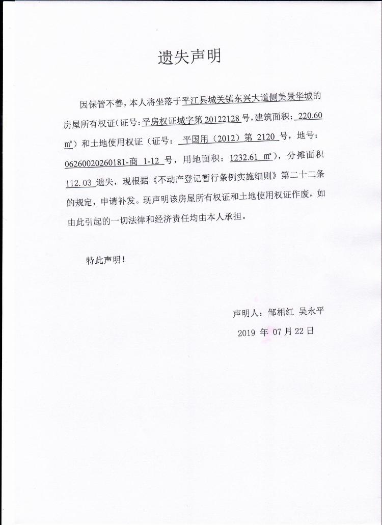 邹相红 吴永平房屋所有权证和土地所有权证遗失声明.