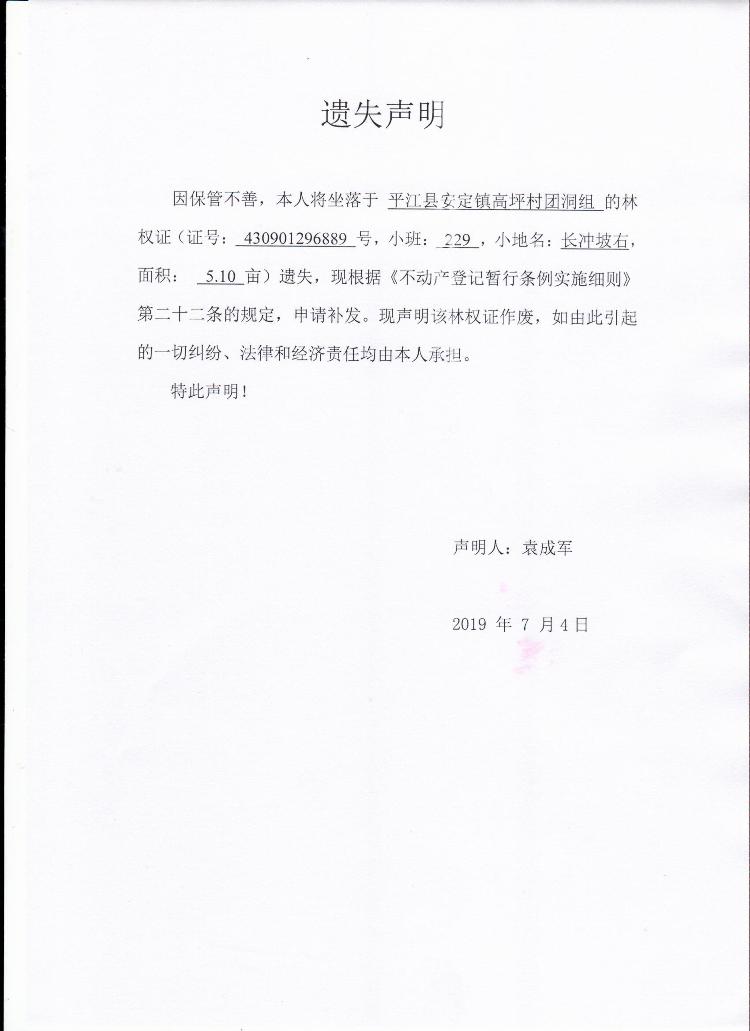 袁成军林权证遗失声明