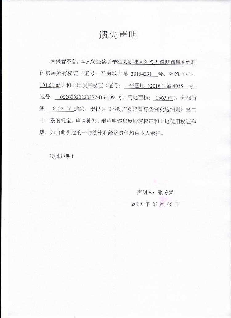 张练舞房屋所有权证和土地使用权证遗失声明