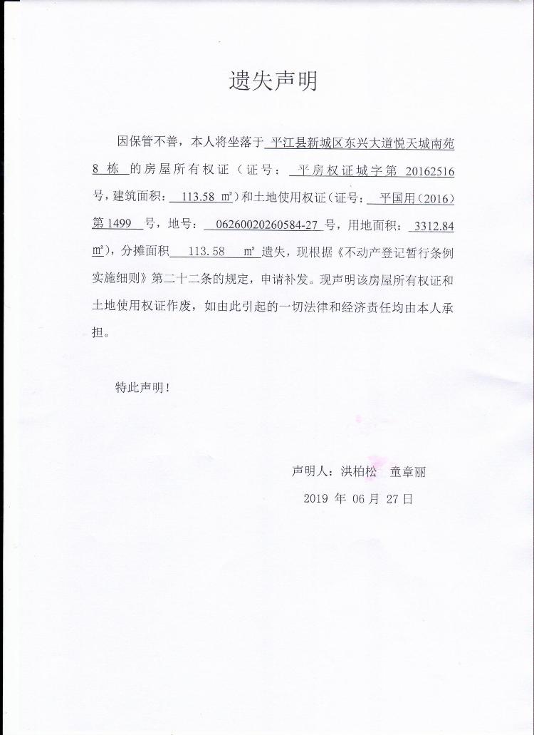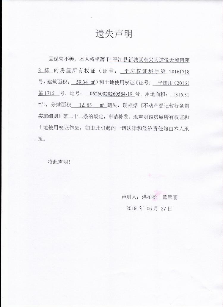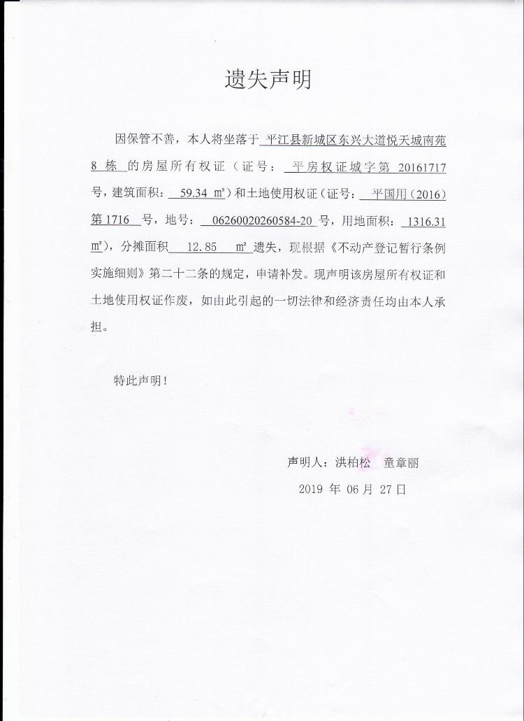 洪柏松房屋所有权证和土地使用权证遗失声明