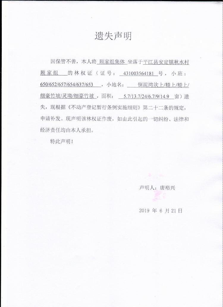 顾家组集体林权证遗失声明1