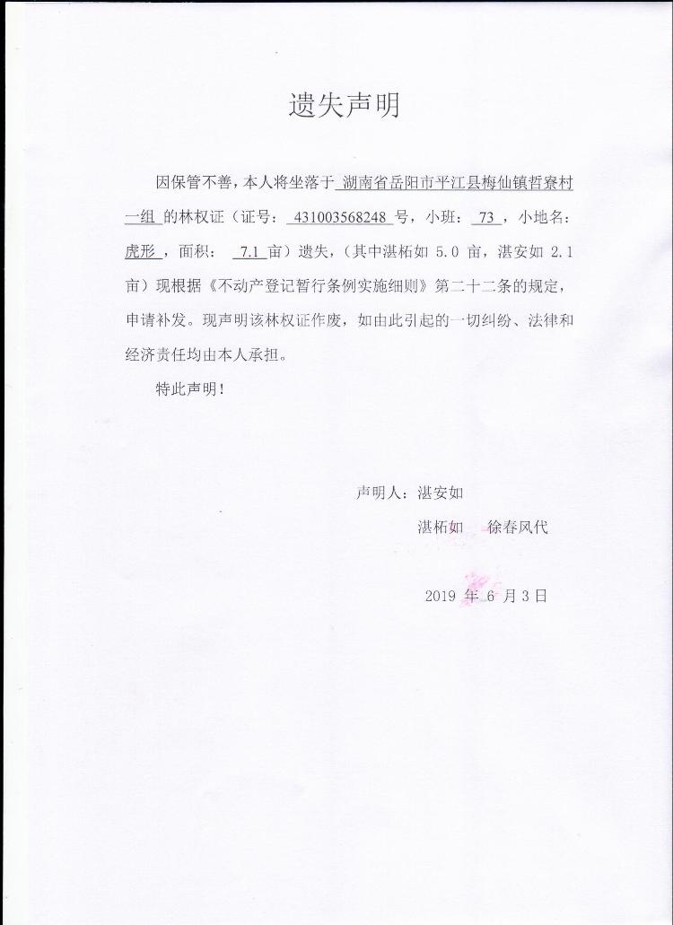 湛柘如等二户林权证遗失声明