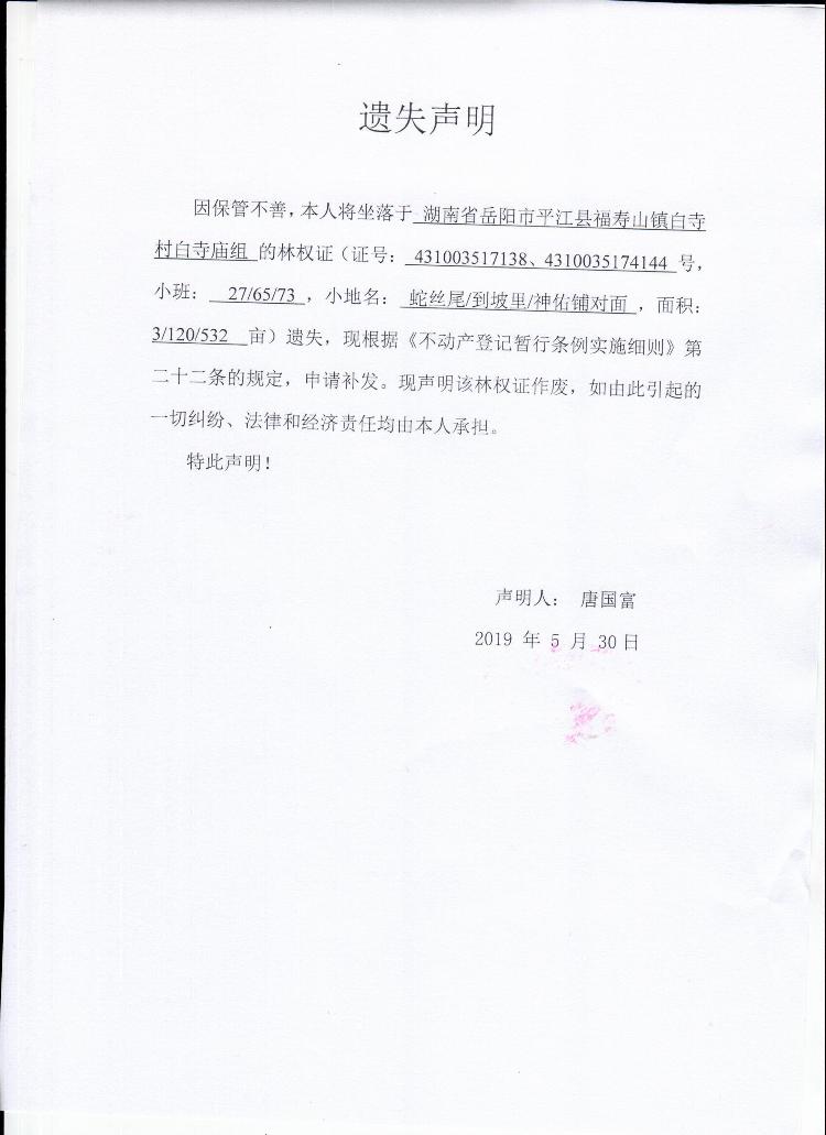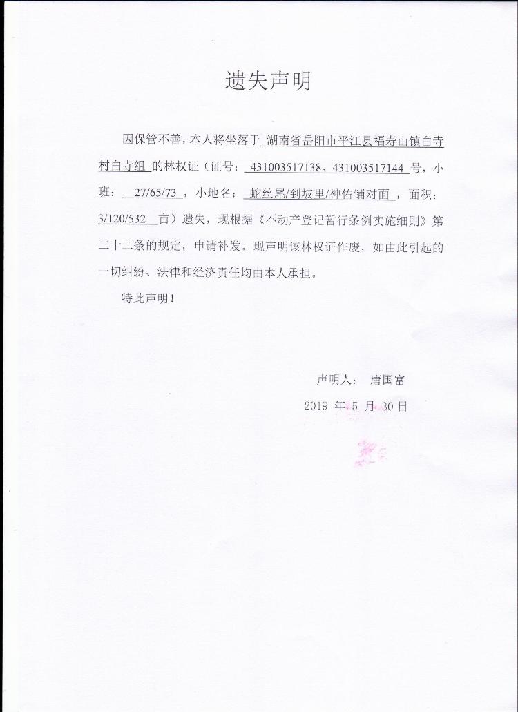 唐国富林权证遗失声明