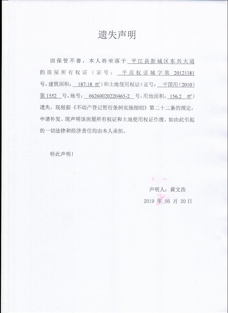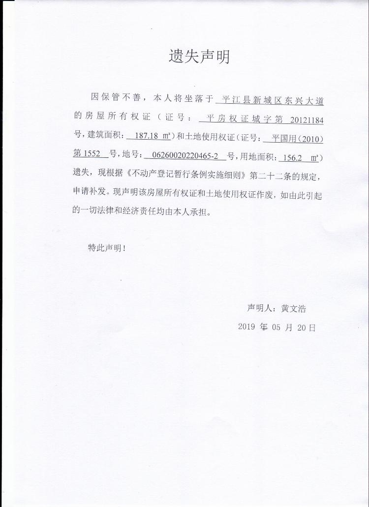 黄文浩房屋所有权证和土地使用权证遗失声明