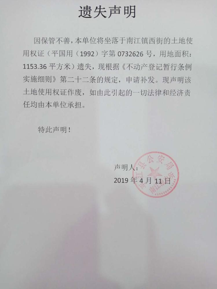 平江县公安局南江派出所土地使用权证遗失声明