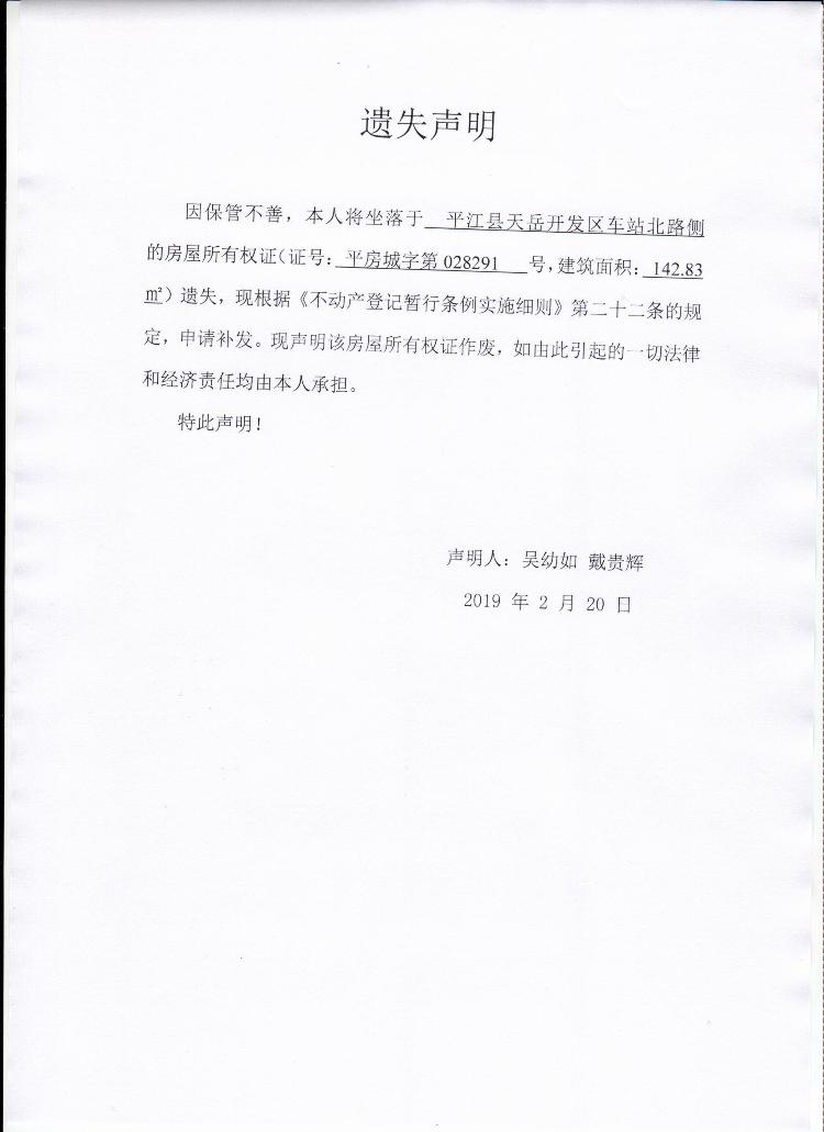 吴幼如 戴贵辉房屋所有权证遗失声明