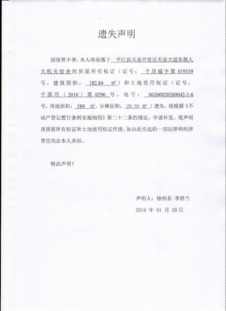 徐些东 李胜兰房屋所有权证和土地使用权证遗失声明