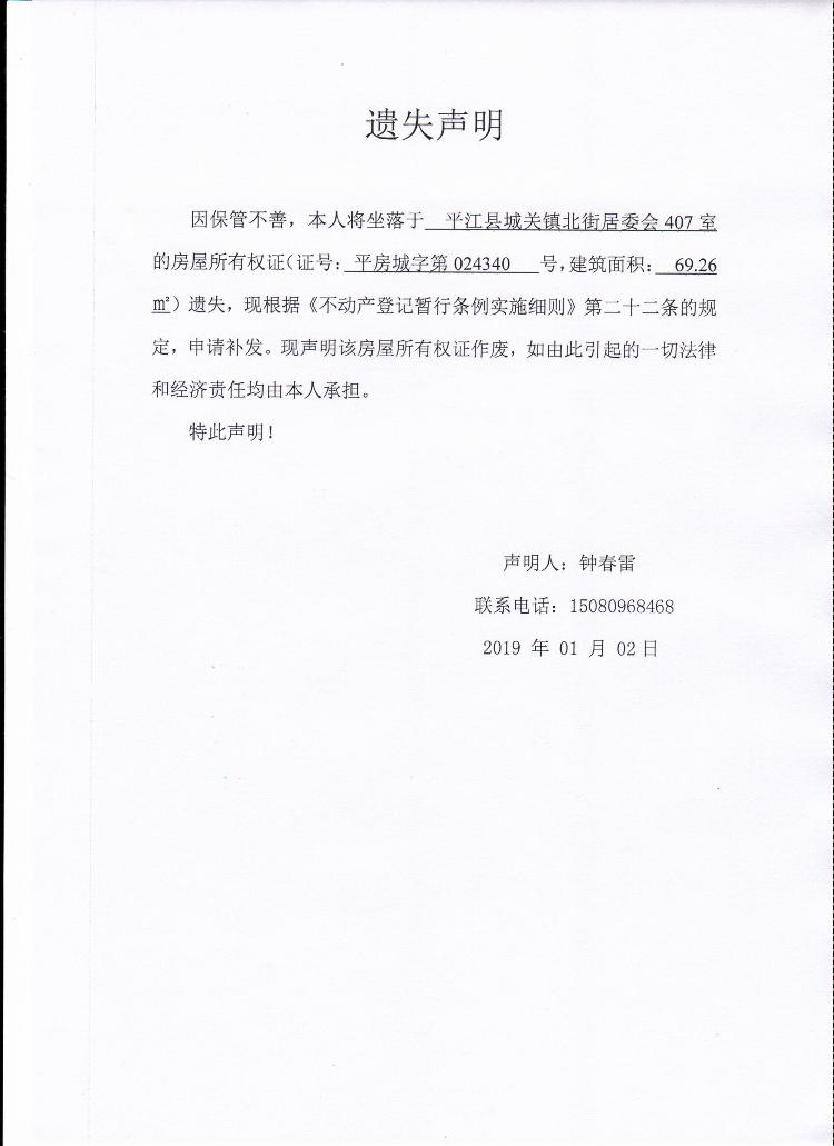钟春雷房屋所有权证遗失声明