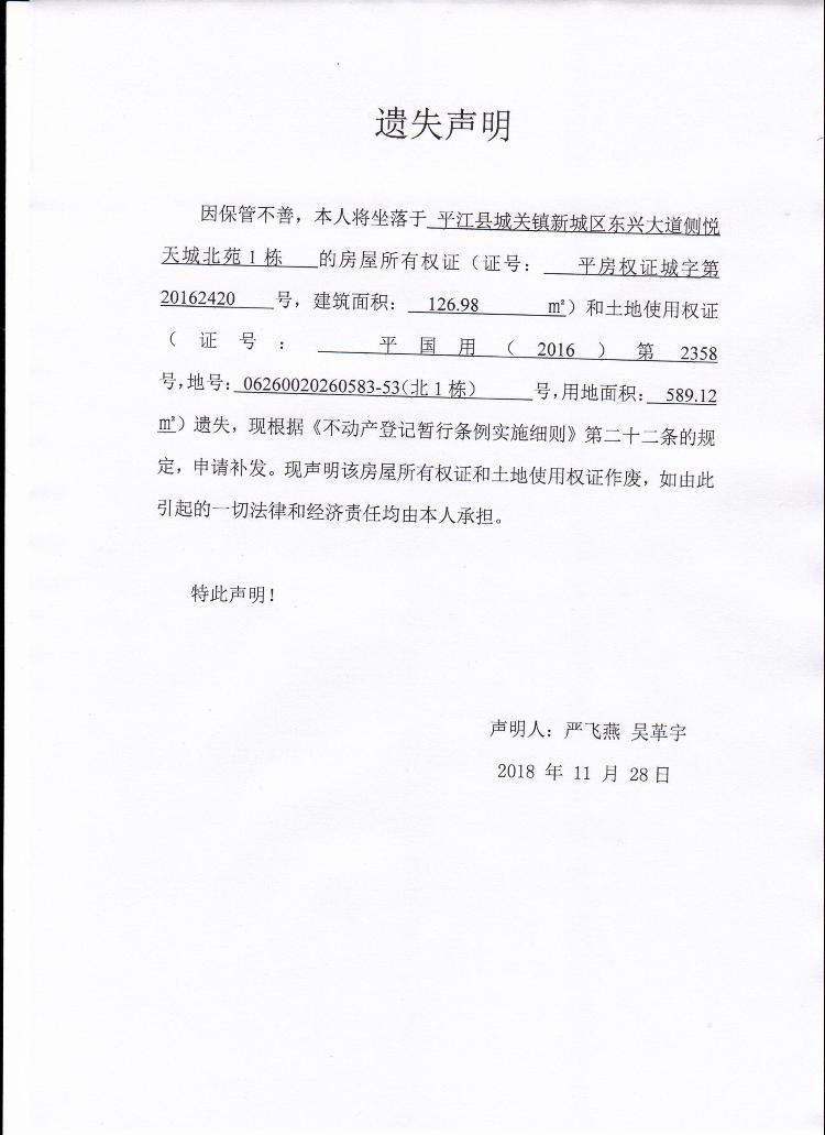 严飞燕 吴革宇房屋所有权证和土地使用权证遗失声明