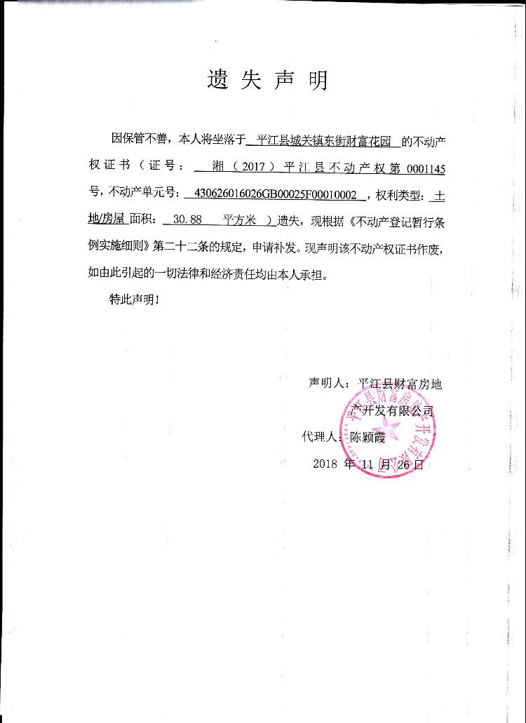 平江县财富房地产开发有限公司不动产权证遗失声明2