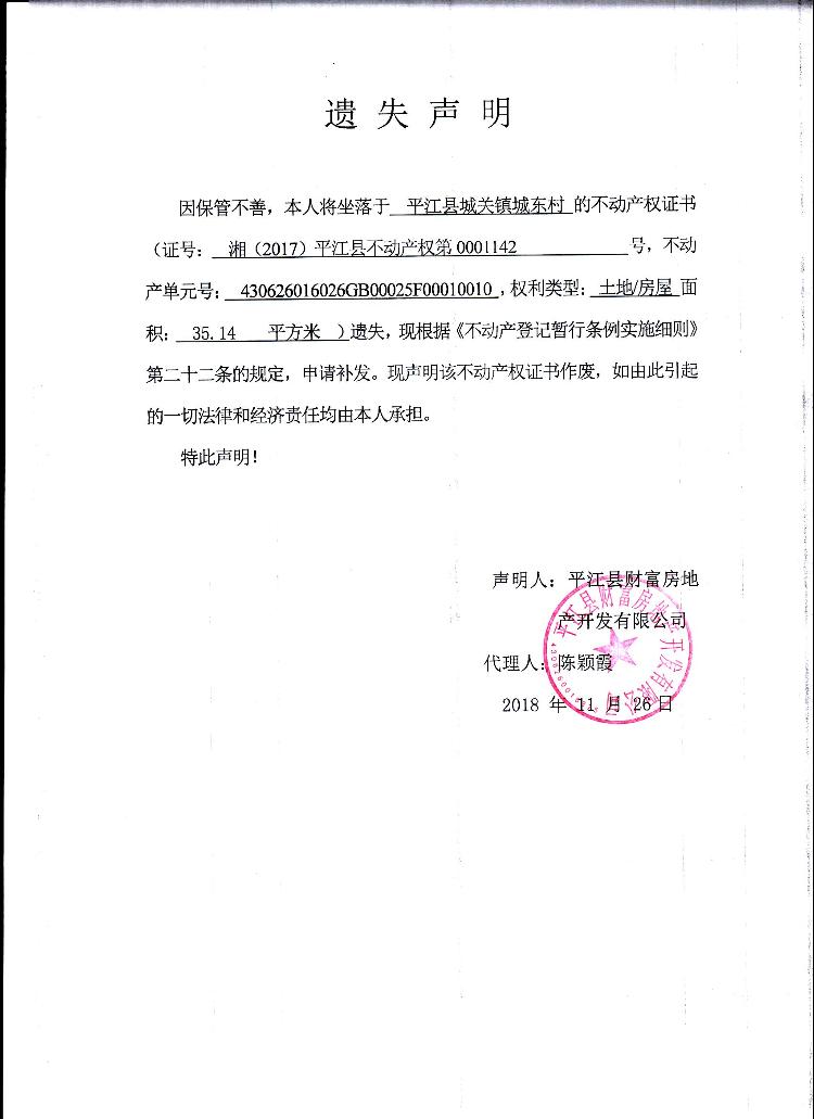 平江县财富房地产开发有限公司不动产权证遗失声明1
