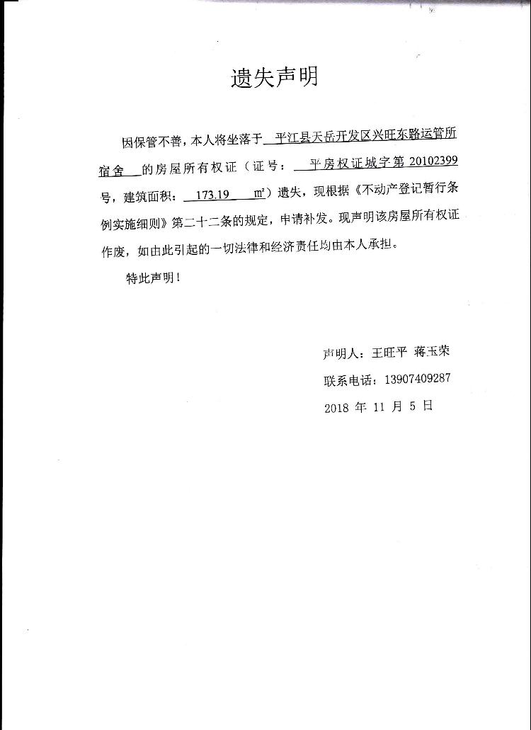 王旺平 蒋玉荣房屋所有权证遗失声明