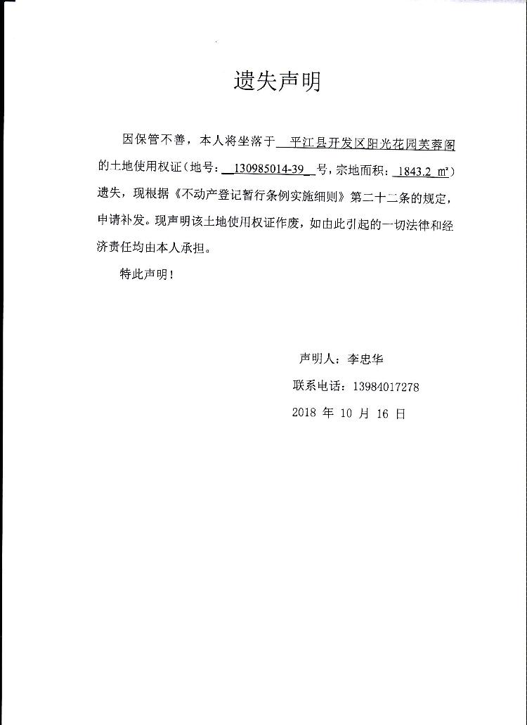 李忠华国有土地使用权证遗失声明(阳光花园芙蓉阁)
