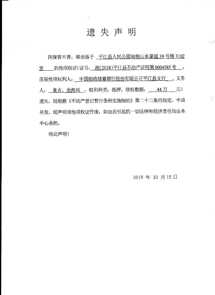 童贞 余海兴他项权证遗失声明