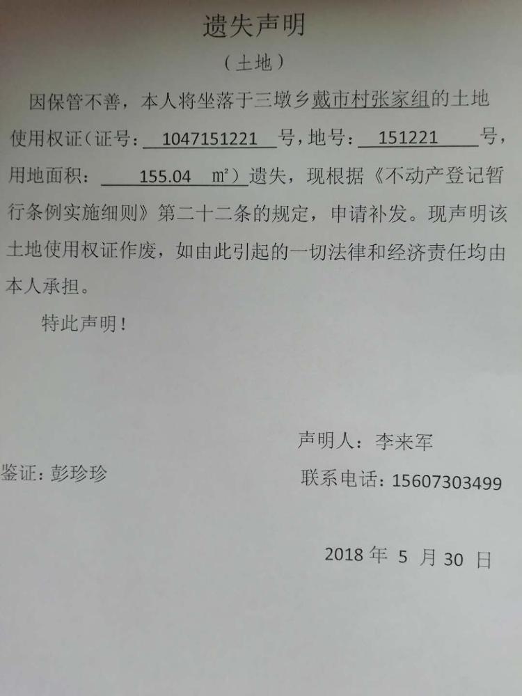 李来军土地使用权证遗失声明