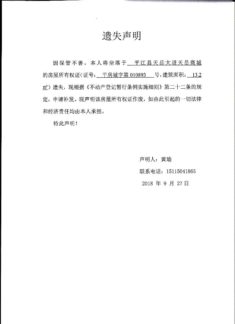 黄瑜房屋所有权证遗失声明