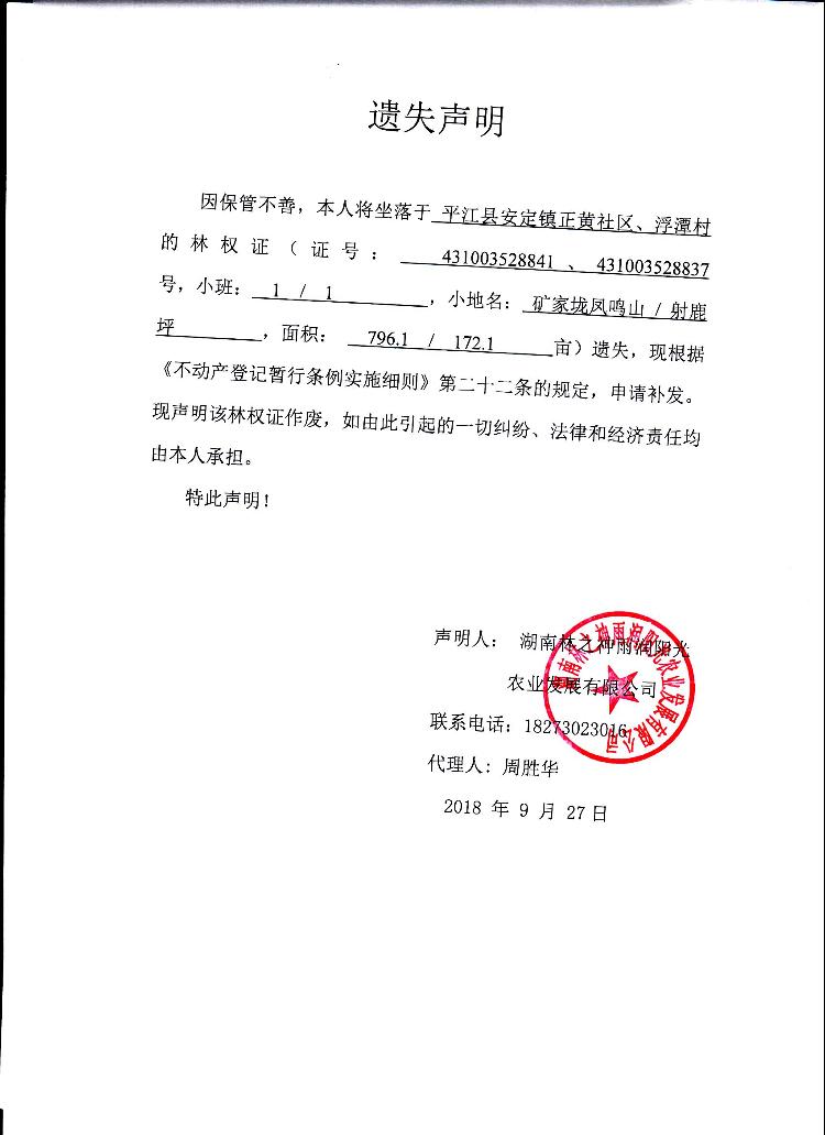 湖南林之神雨润阳光农业发展有限公司林权证遗失声明