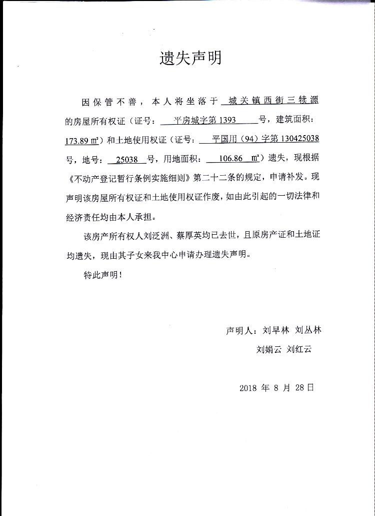 刘泛洲 蔡厚英房屋所有权证和国有土地使用证遗失声明