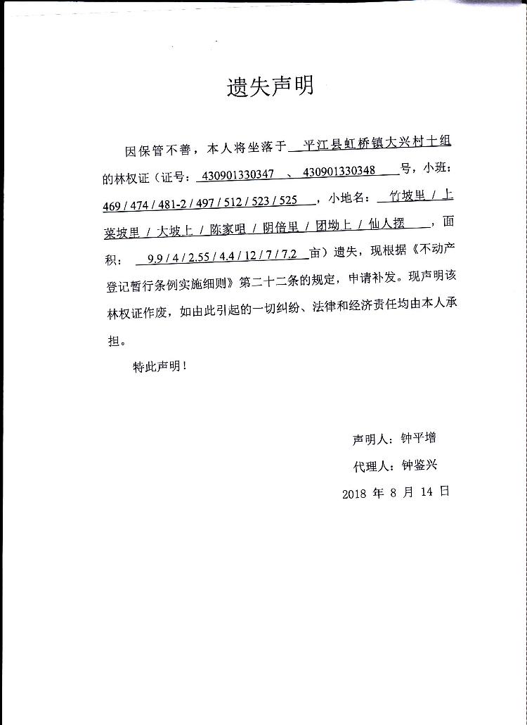 钟平增林权证遗失声明