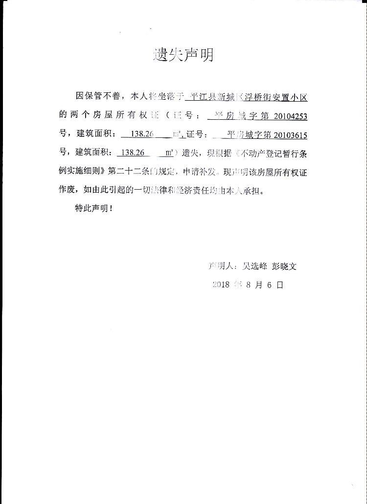 吴选峰 彭晓文房屋所有权证遗失声明