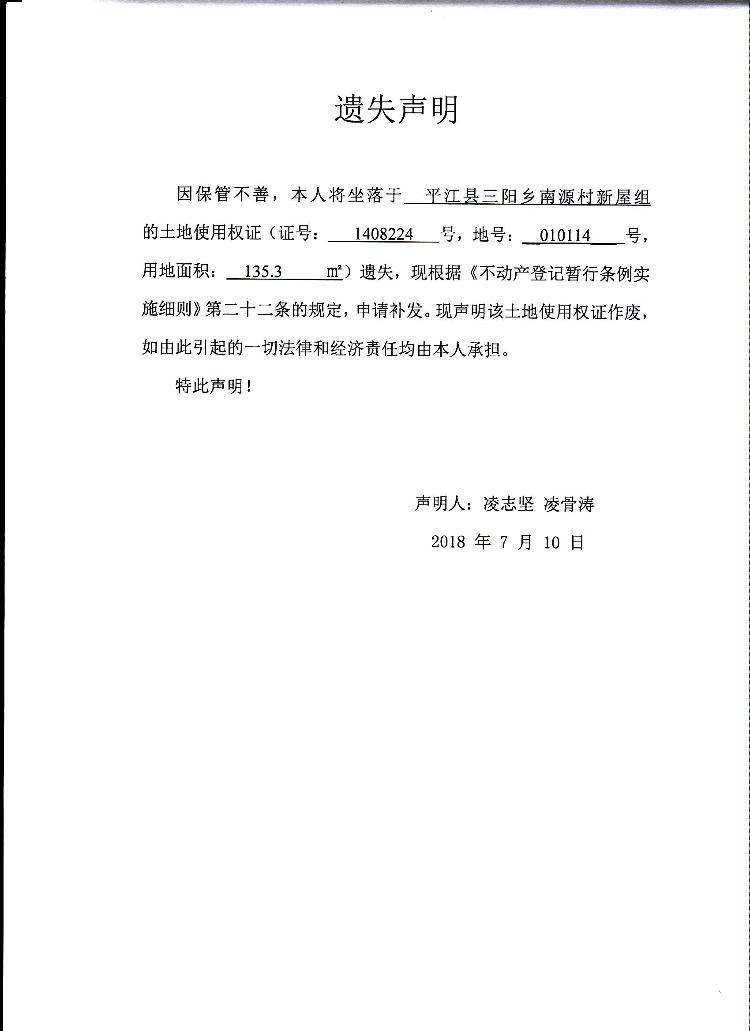 凌志坚 凌骨涛土地使用权证遗失声明