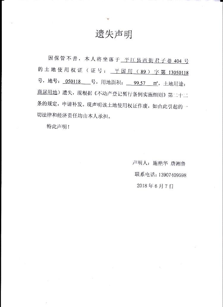 施艳华 唐湘鲁国有土地使用权证遗失声明