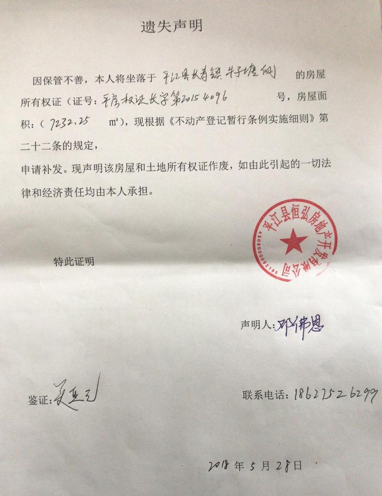 平江县恒弘房地产开发有限公司房屋所有权证遗失声明