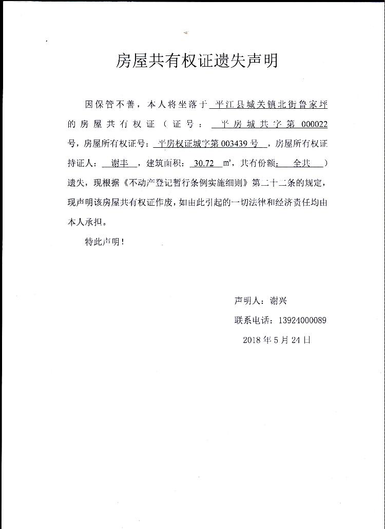 谢兴房屋共有权证遗失声明