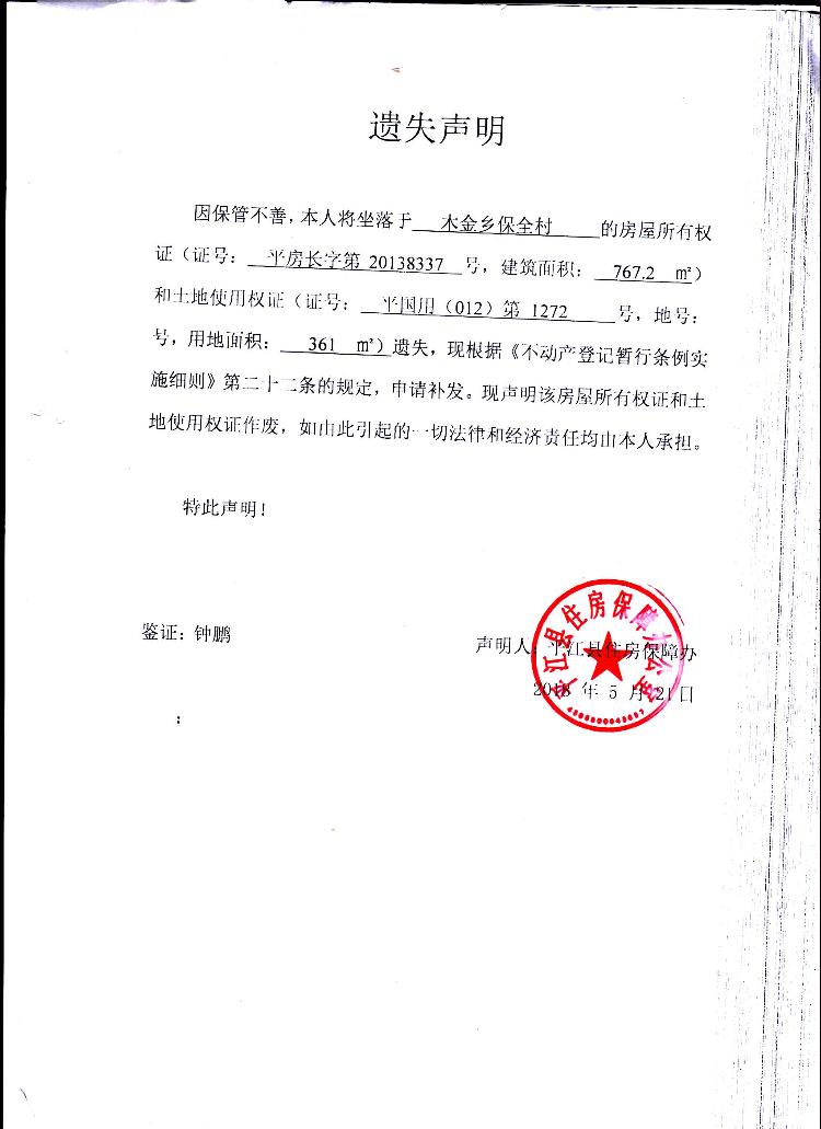 平江县住房保障办遗失声明