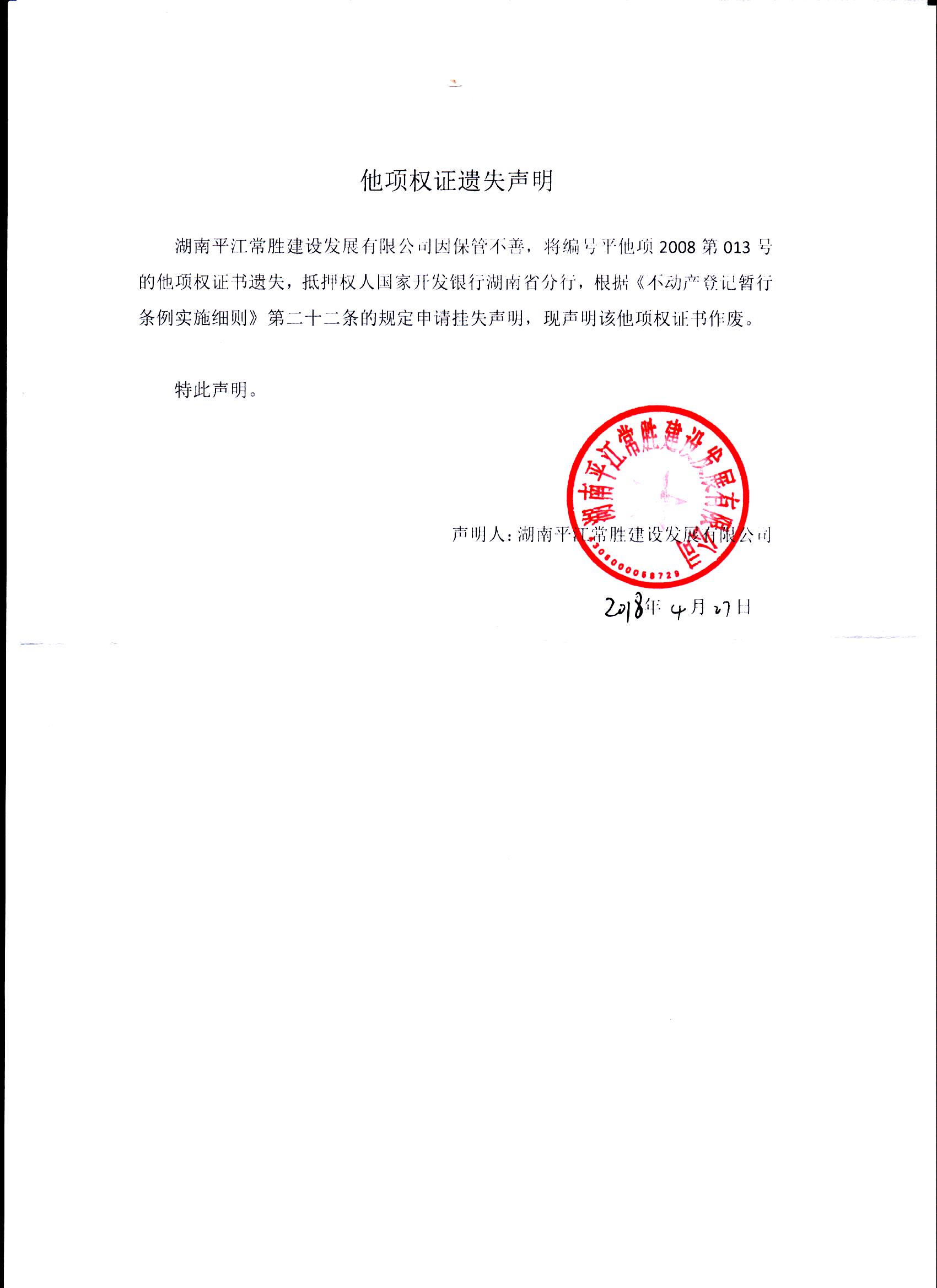 湖南平江常胜建设发展有限公司他项权证遗失声明
