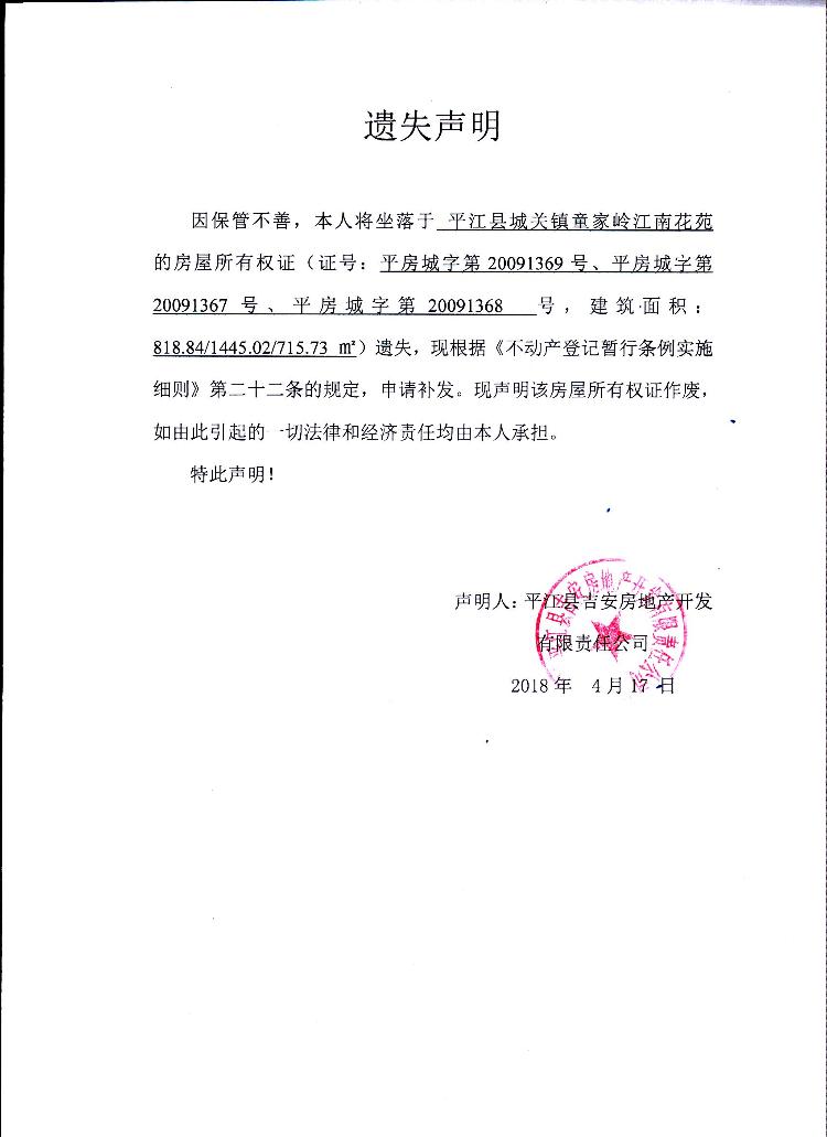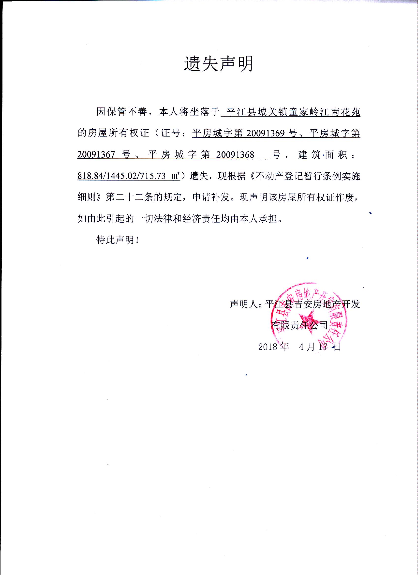 平江县吉安房地产开发有限责任公司房屋所有权证遗失声明