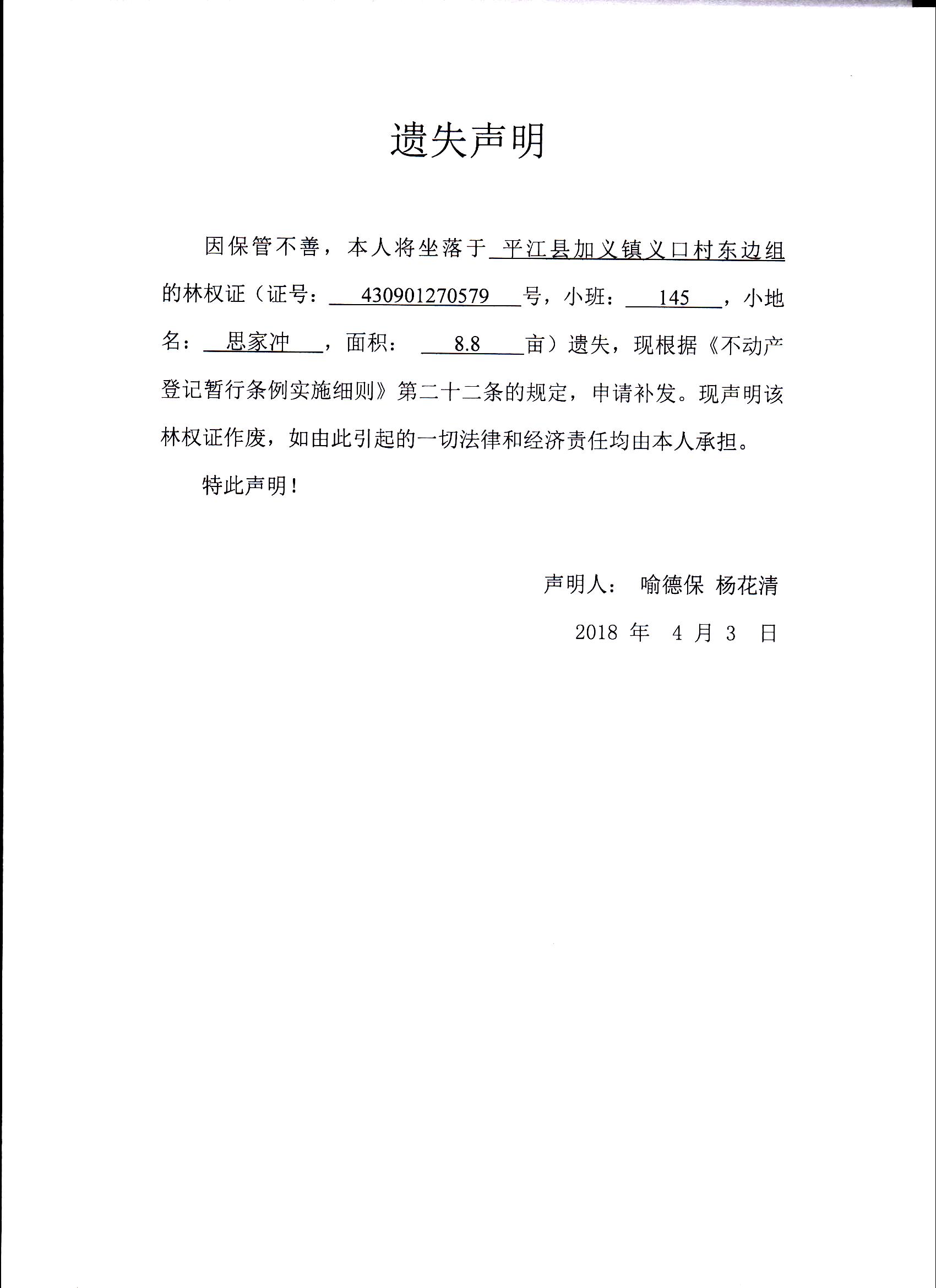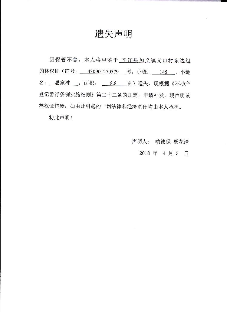 喻德保、杨花清林权证遗失声明