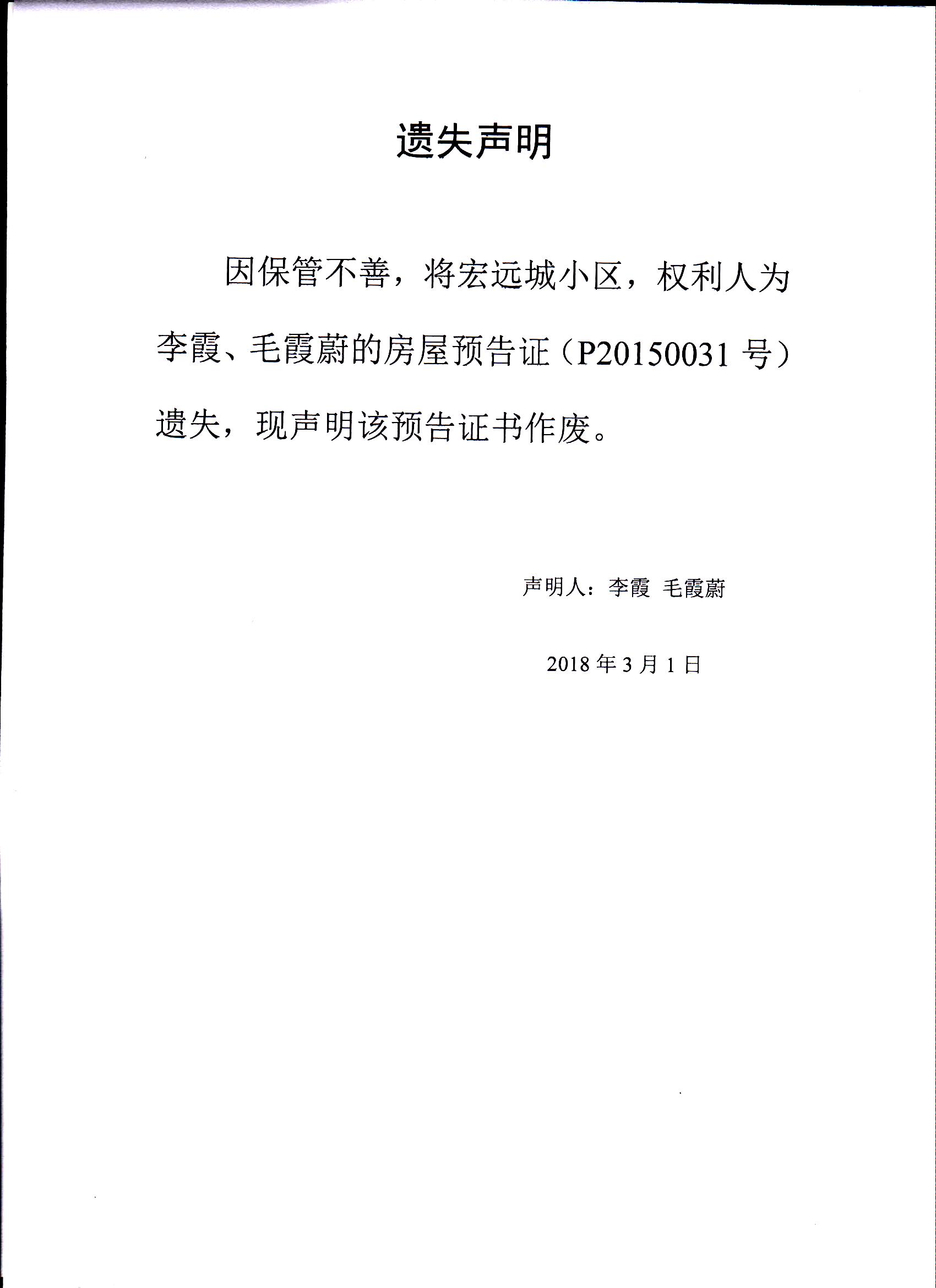 李霞、毛霞蔚遗失声明