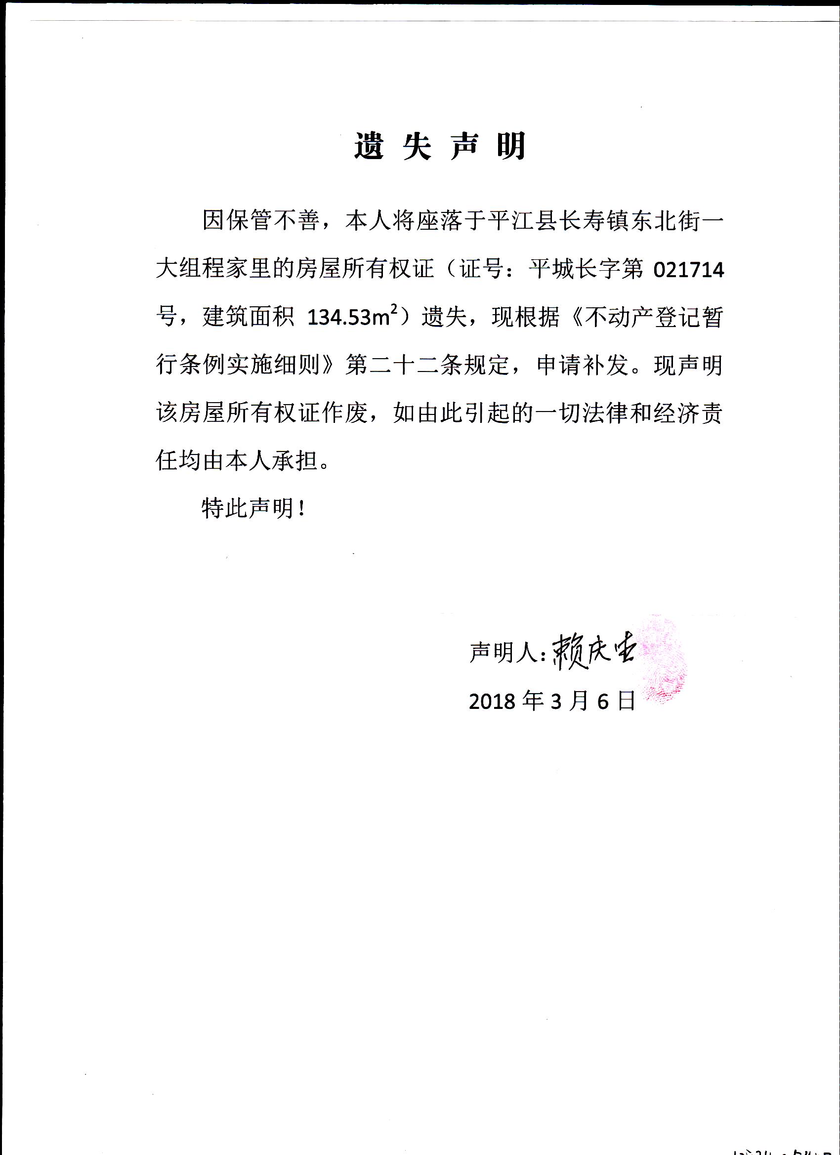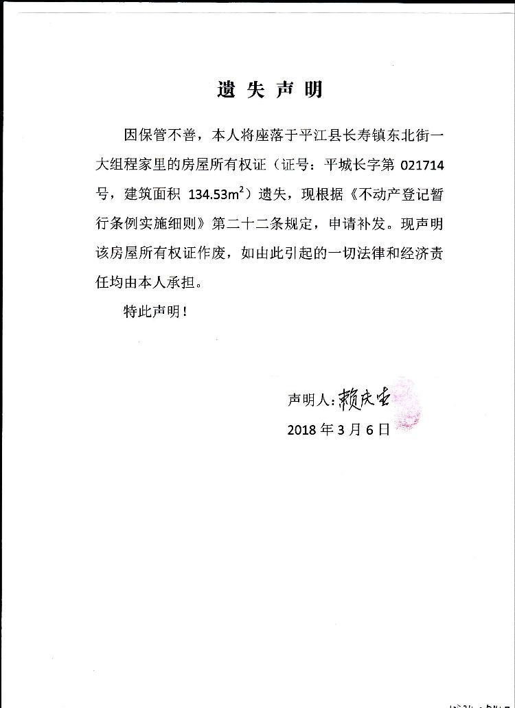 赖庆生房屋所有权证遗失声明