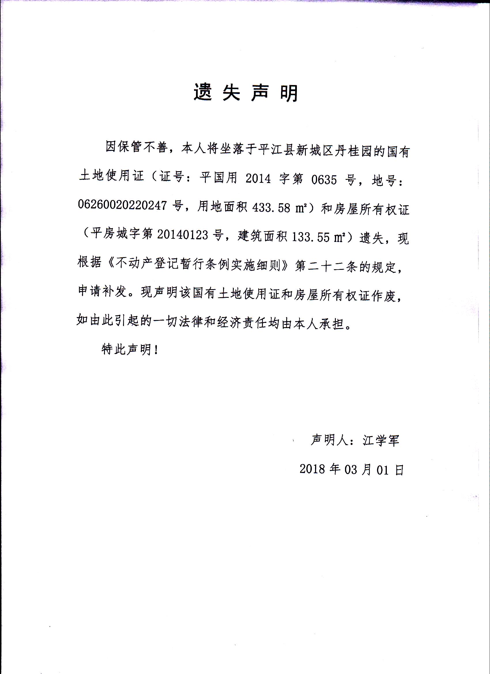江学军国有土地使用权证和房屋所有权证遗失声明