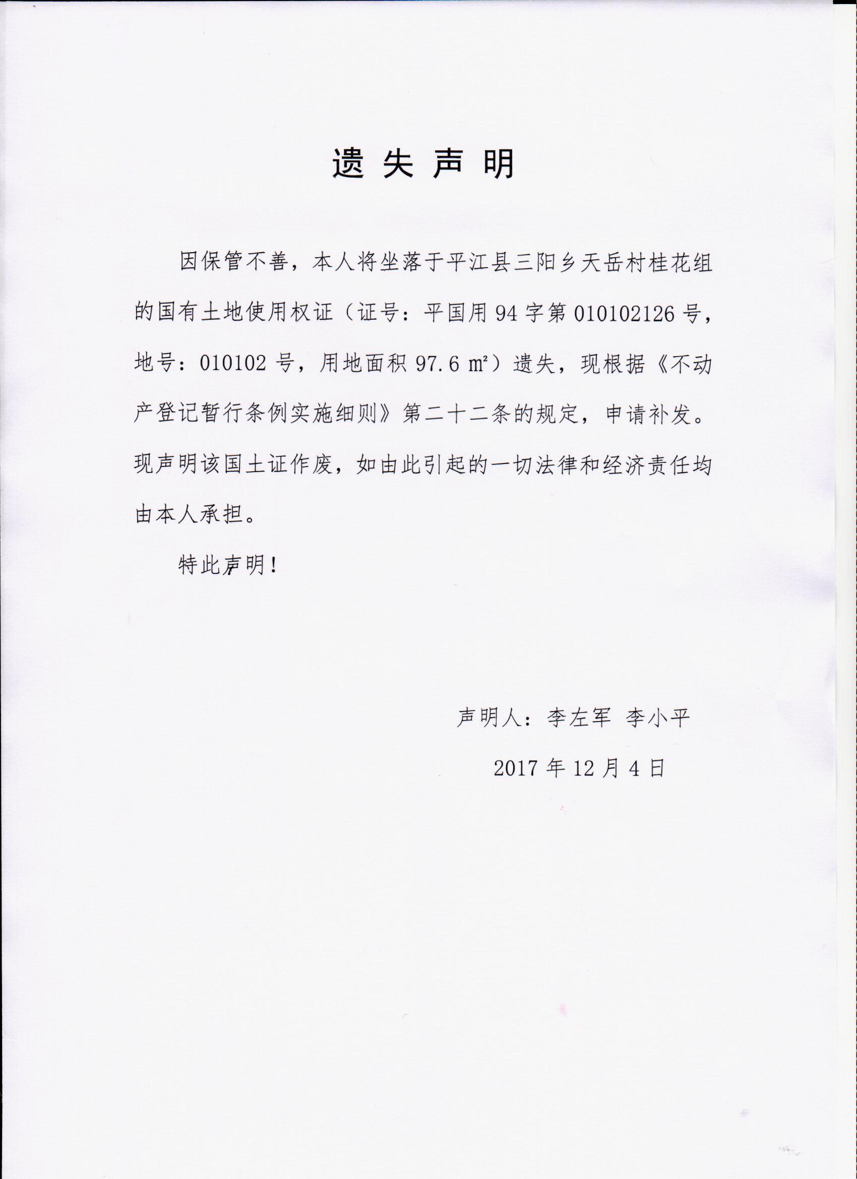 李左军、李小平国土证遗失声明