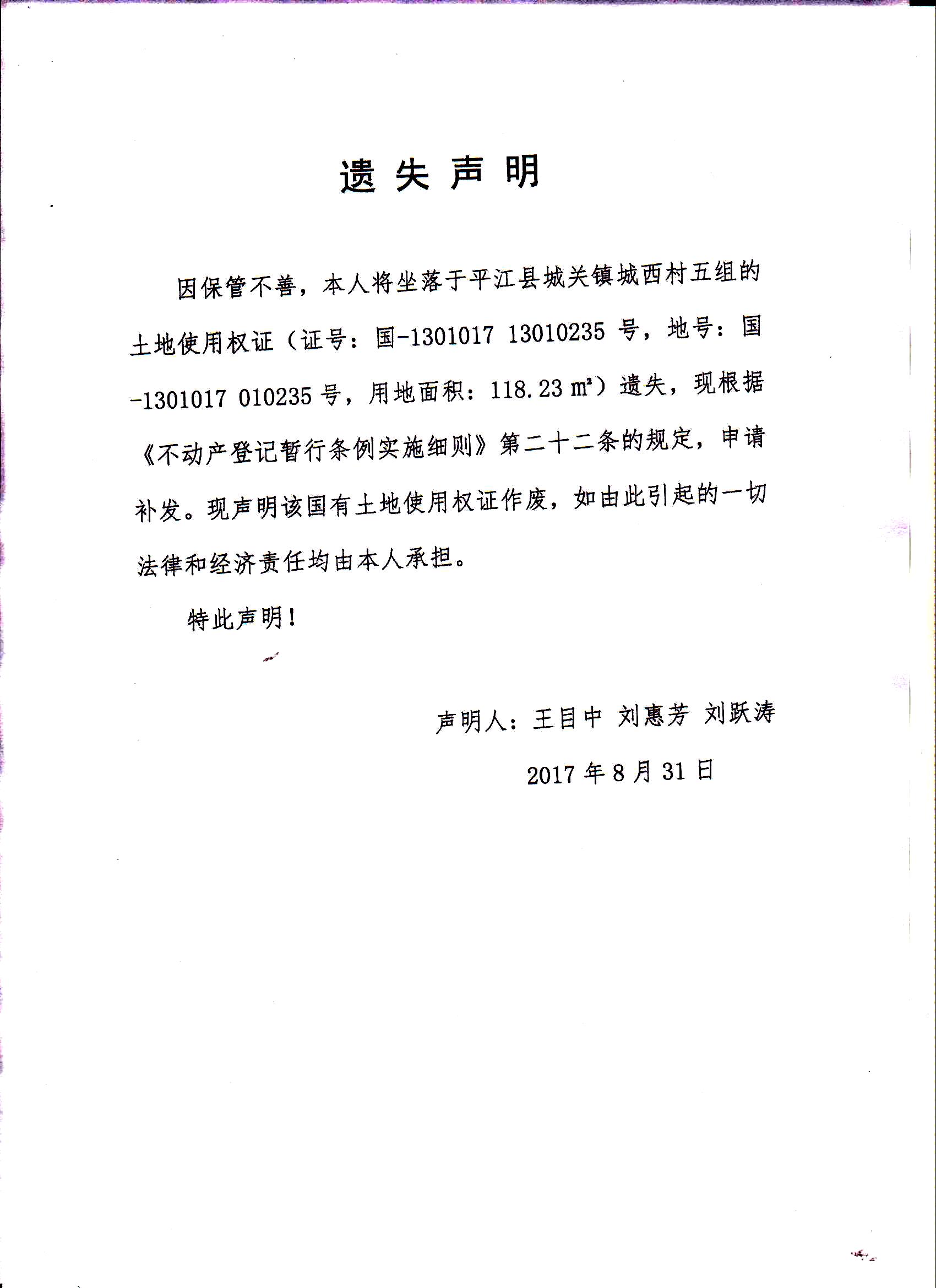 王目中、刘惠芳,刘跃涛国土证遗失声明