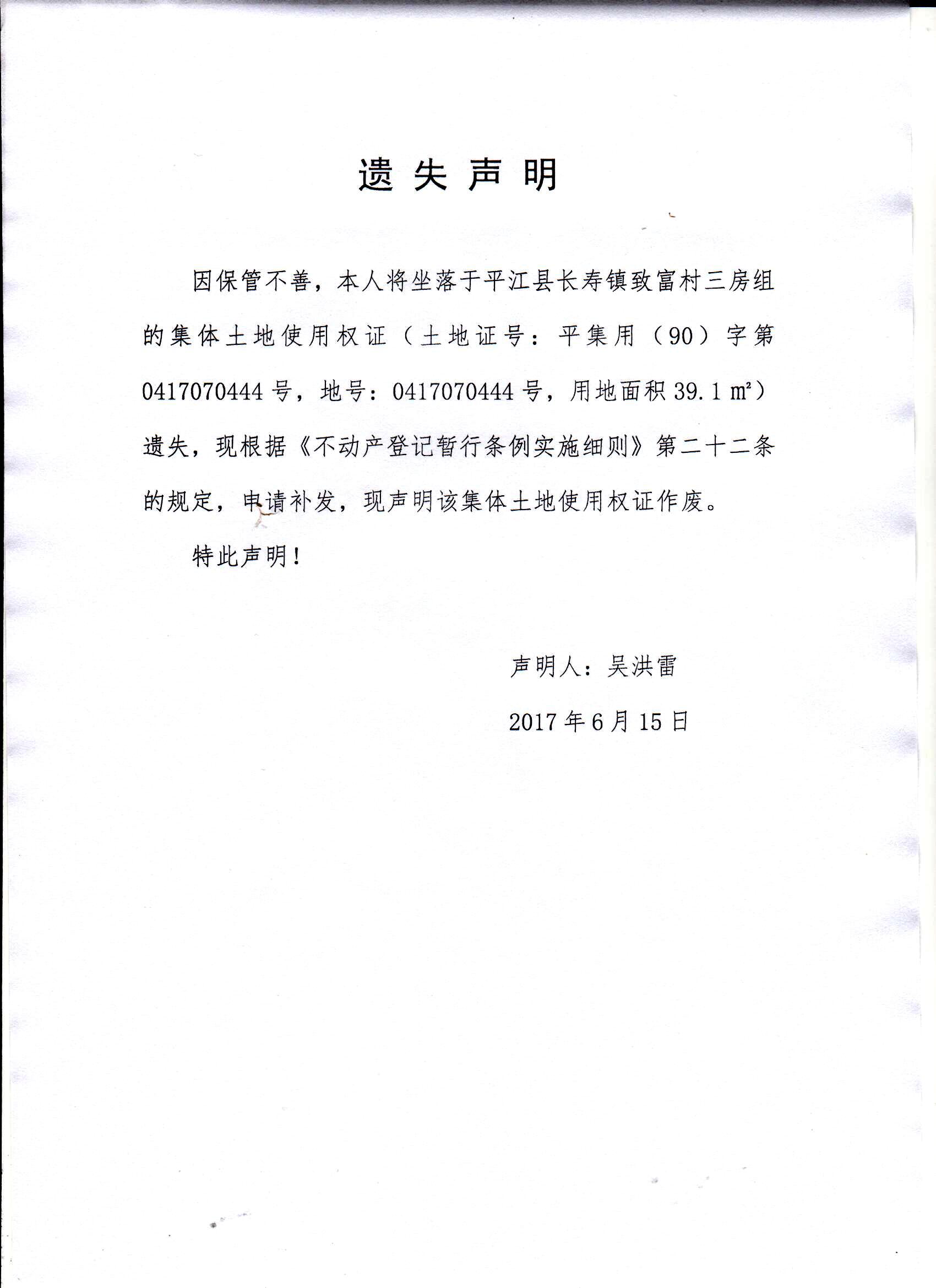吴洪雷集体土地使用权证遗失声明