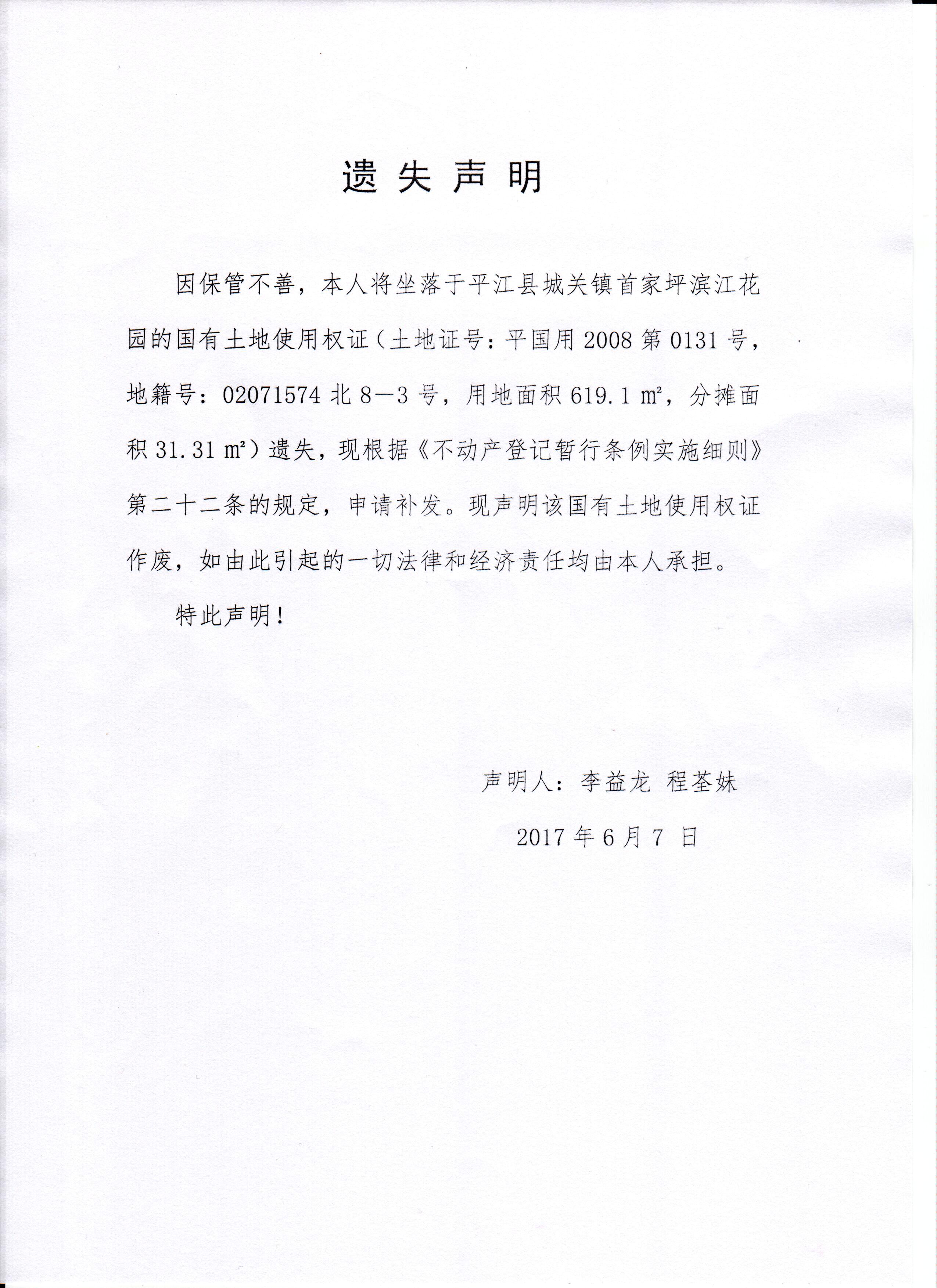 李益龙、程荃妹国有土地使用权证遗失声明