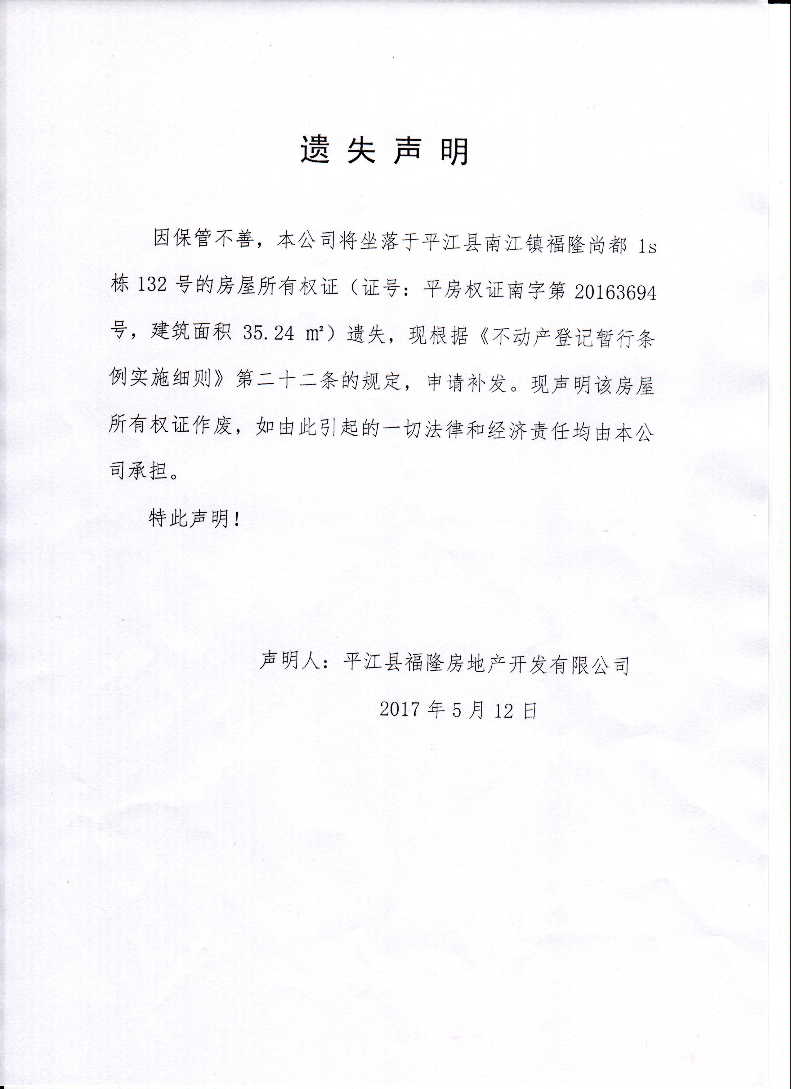 平江县福隆房地产开发有限公司房产证遗失声明