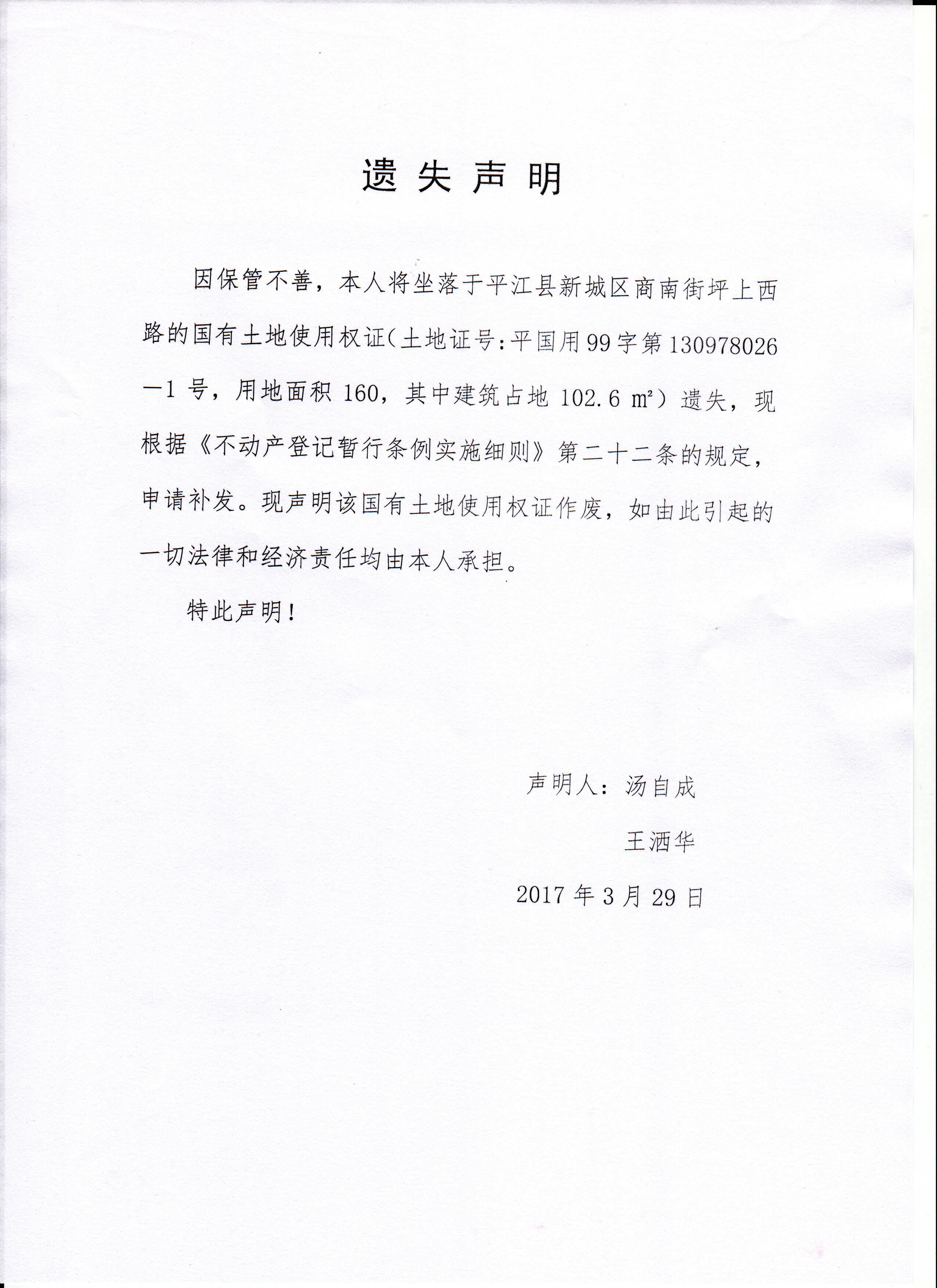 汤自成国有土地使用权证遗失声明
