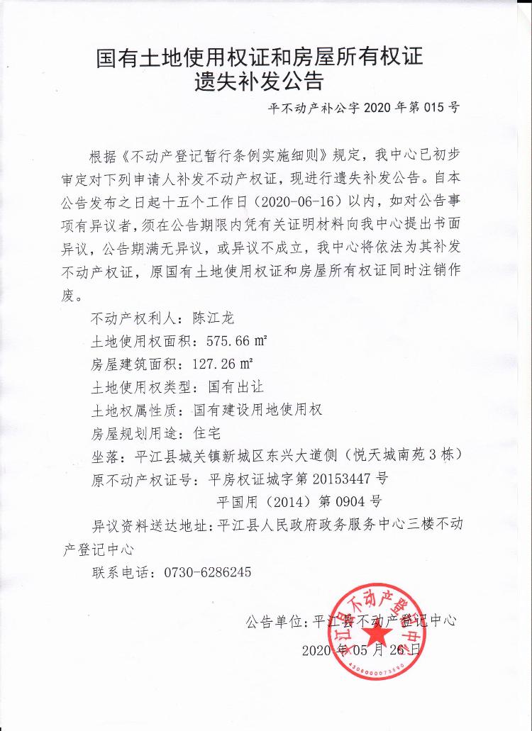 陈江龙国有土地使用权证和房屋所有权证遗失补发公告