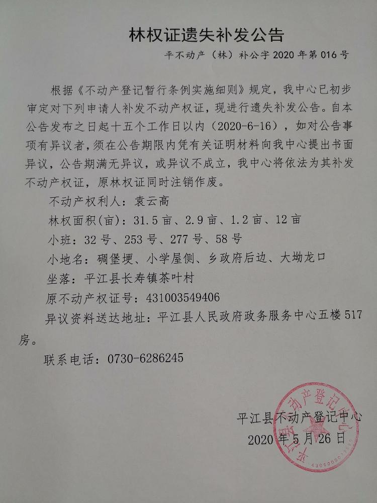 袁云高林权证遗失补发公告