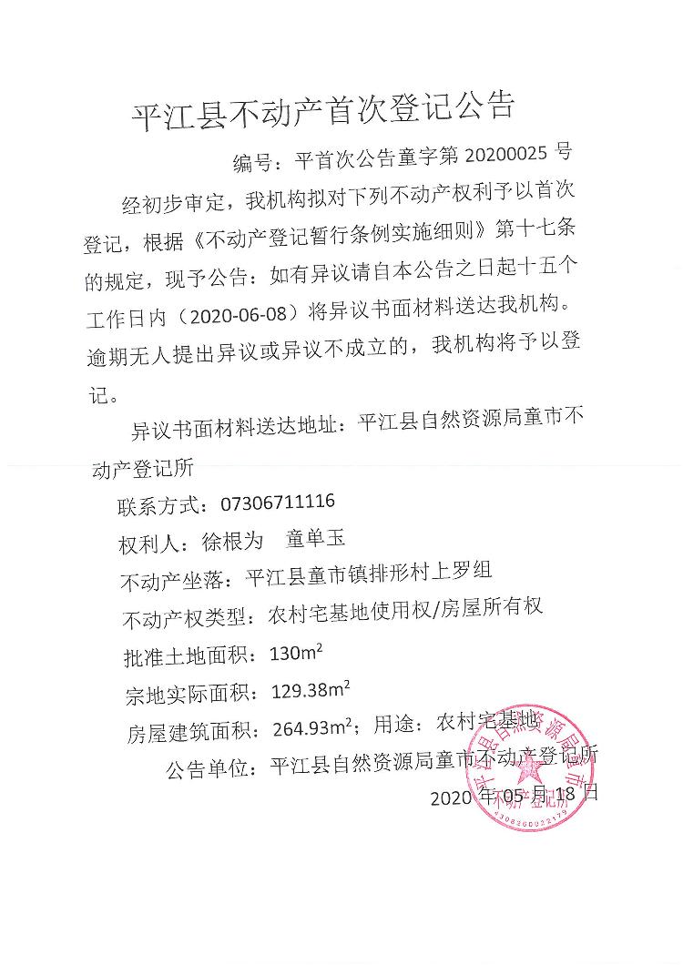 徐根为 童单玉 不动产首次登记公告