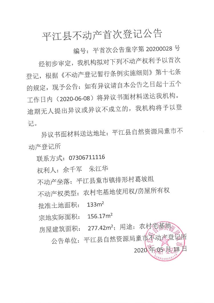 佘千军 朱江华 不动产首次登记公告