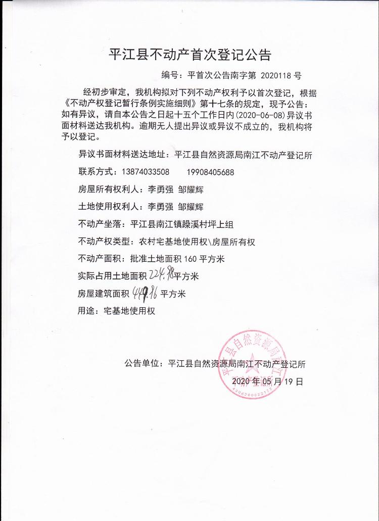 李勇强 邹耀辉不动产首次登记公告南字第2020118