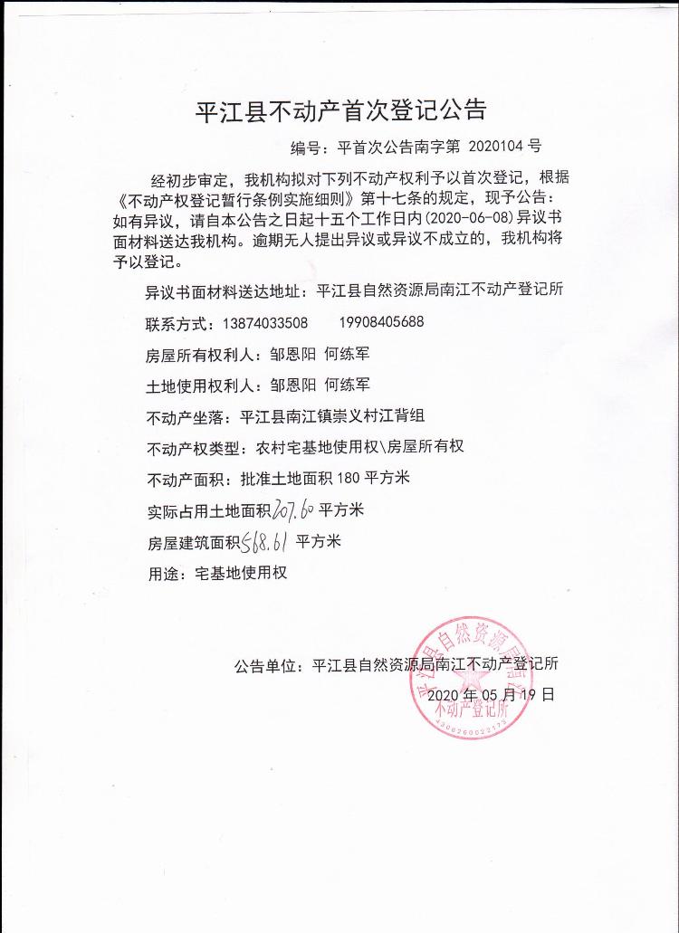 邹恩阳 何练军不动产首次登记公告南字第2020104号